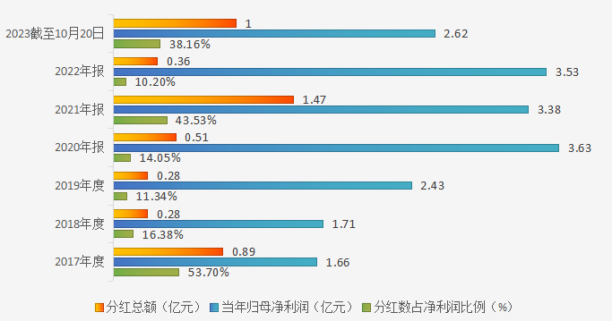 恒林股份自上市以來,堅持穩健的現金分(fēn)紅政策,以積極回饋股東。每年分(fēn)紅幾成公(gōng)司傳統,加上過往的股份回購(gòu),目前累計派發現金額已近5億元(如上圖);尤其2021年度在現金紅利基礎上還疊加了每10股轉增4股的更高回報。根據公(gōng)司2023年半年度報告和最新(xīn)10月20日公(gōng)布的2023年中(zhōng)期權益分(fēn)派方案,拟每10股派7.2元,合計派發現金紅利100,128,262.32元,占當期淨利潤比例38.16%,按照每股分(fēn)紅和10月20日收盤股價計算,股息率達到2.17%。